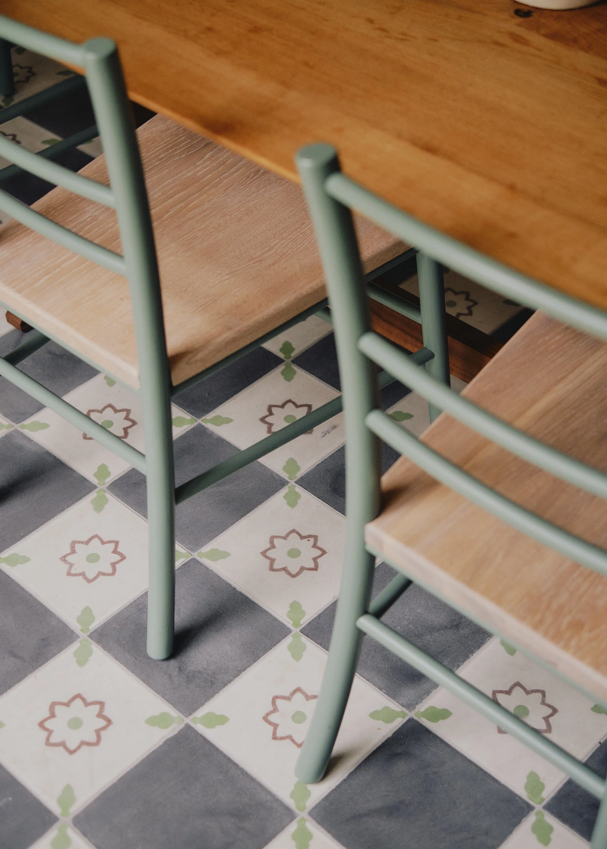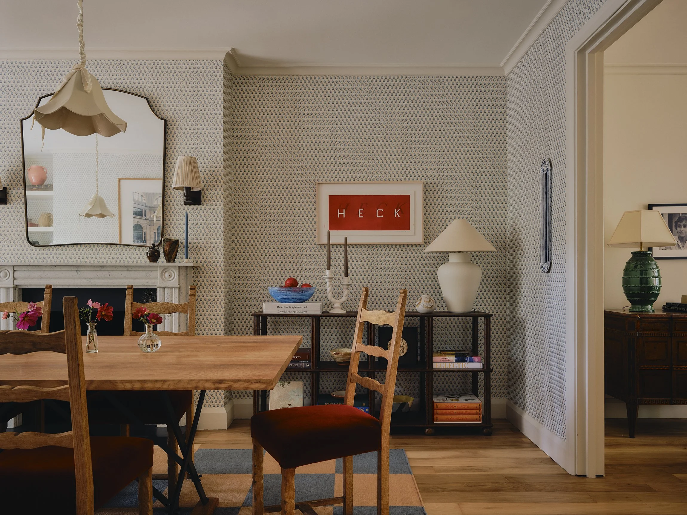The Breakfast Room, connected to the Kitchen, allows for more informal family dining, with bold tones & textures to complement the array of artwork hanging above in a gallery format. The new floor tiling gives a subtle nod to the monochromatic kitchen, and adds a playful touch to the space.